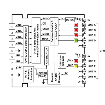 Acest Tibbit este un convertor analog-digital (ADC) Sigma-Delta (Σ-Δ) izolat pe 24 de biți ±10V și 4–20mA, cu o ieșire izolată de 24VDC.